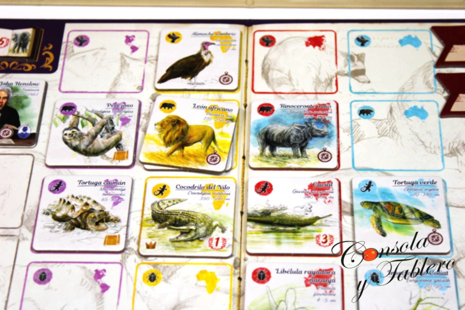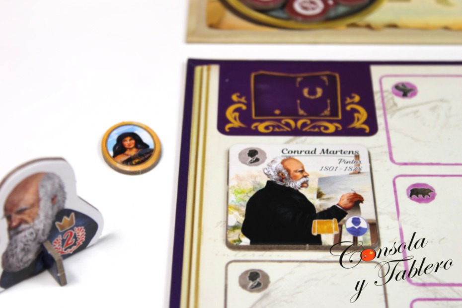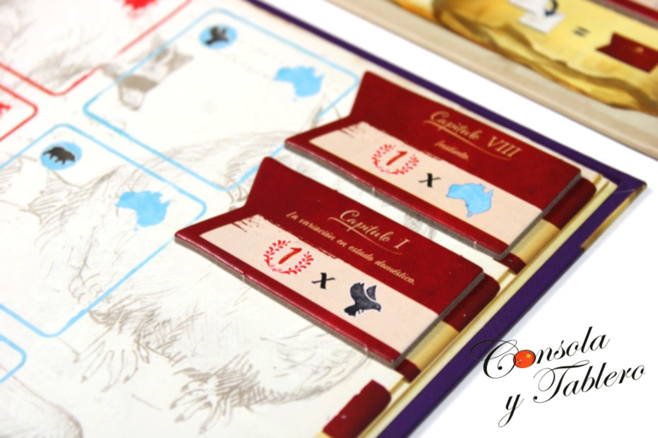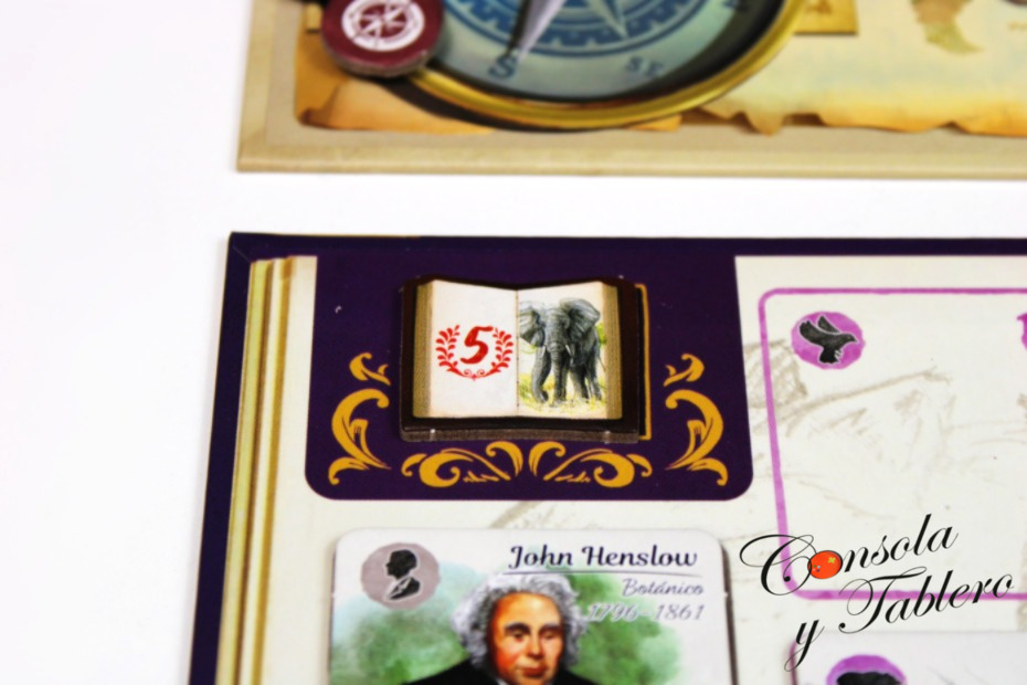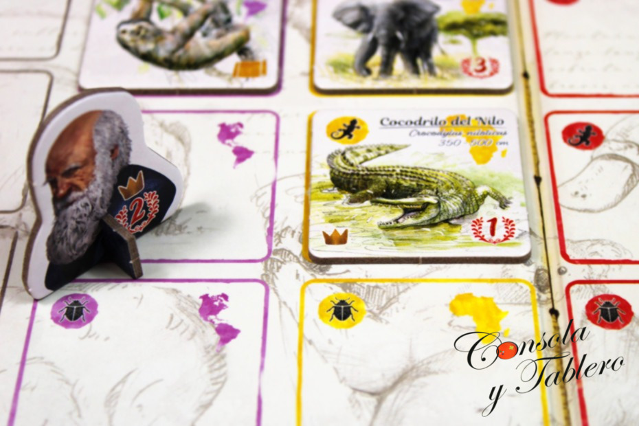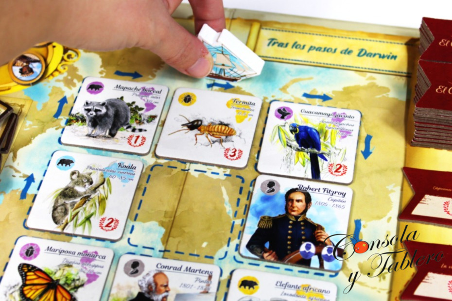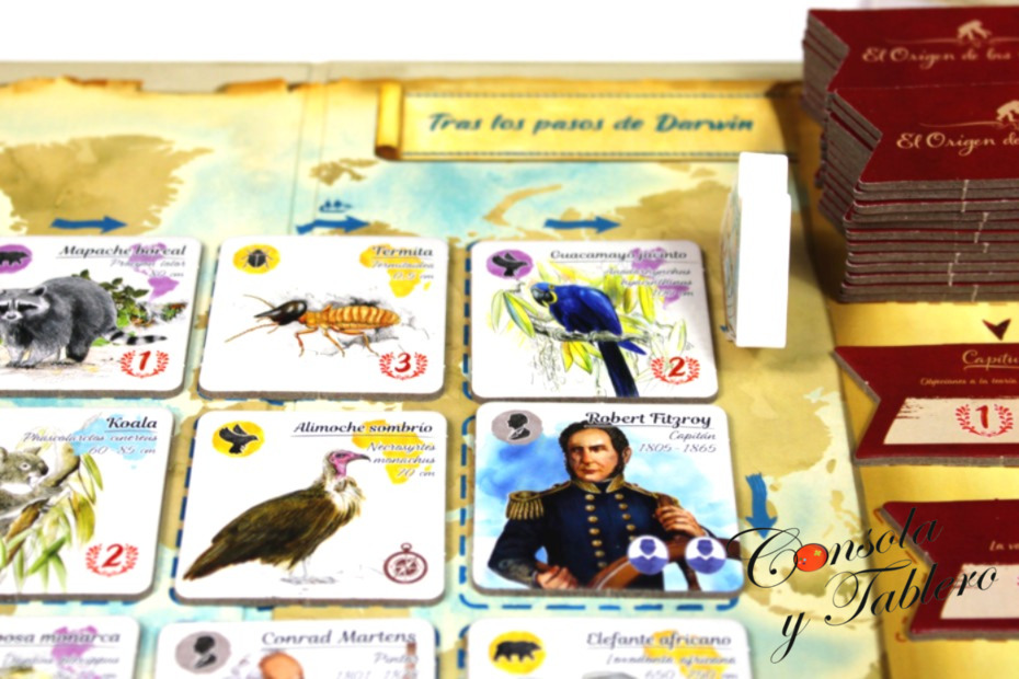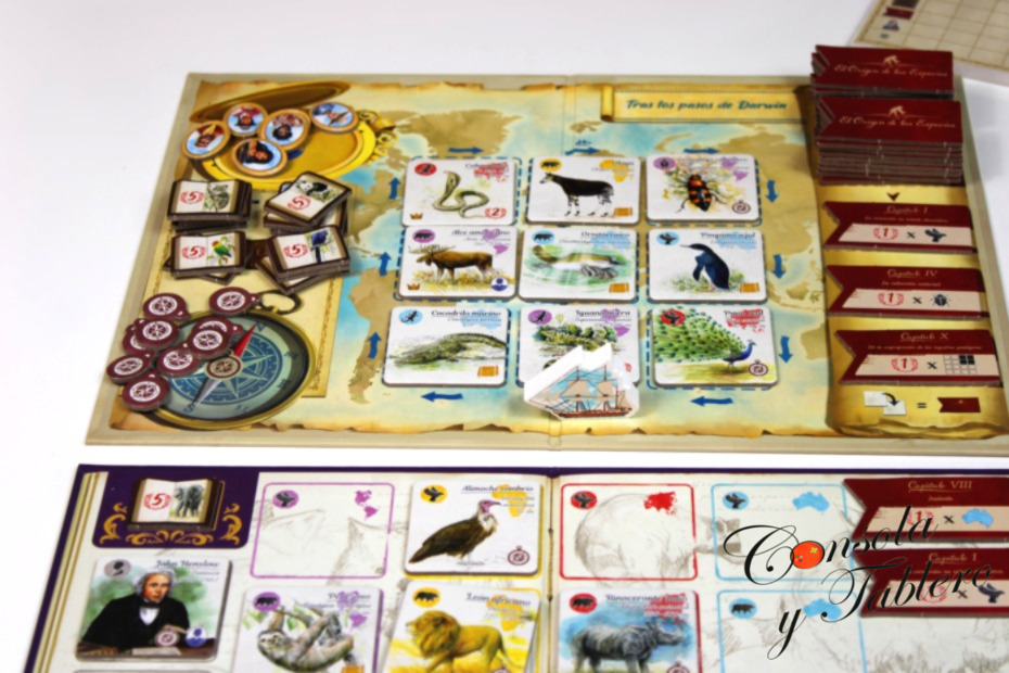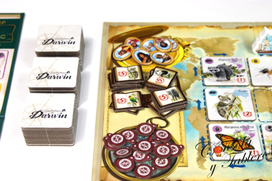 Componentes de juego.Antes de empezar, preparamos el escenario. Situamos cada componente en su sitio. Utilizaremos nueve losetas para el tablero y 12 por jugador.Cada uno recibe un cuaderno. El inicial, la ficha de Darwin.Sobre el cuaderno situaremos una ficha de guía y una loseta de teoría al azar.Empezamos el turno tomando una de las tres losetas de la línea frente al Beagle.La colocamos en el cuaderno, atendiendo a su clase y ecosistema.Recibimos una brújula o una ficha de guía si así se indica en la loseta elegida.Los personajes tienen sus zonas reservadas en el cuaderno (tres espacios). También pueden otorgar bonificaciones inmediatas.Al seleccionar un animal emblemático, nos llevamos la ficha de Darwin. La conservaremos hasta que alguien nos la quite.A continuación, movemos el Beagle tantas flechas hacia delante como distancia había entre él y la loseta escogida.En este caso, se mueve dos flechas. Reponemos el espacio con una nueva loseta de cualquiera de las pilas.Al principio del turno, podemos descartar una ficha de guía para llevar a cabo una acción especial.Se utiliza para mover el Beagle una flecha hacia atrás o hacia delante, antes de seleccionar loseta.La otra acción especial permite descartar todas las losetas frente al Beagle. Las dejamos al fondo de una pila y reponemos los espacios ante de llevarnos una.Cada vez que tapemos un animal con otro de su misma clase y ecosistema, tomamos una ficha de teoría.Puede ser una de las visibles o la primera de una pila. Reponemos el espacio.Funcionan a modo de objetivos.Cubrir los cuatro espacios de una fila o columna por primera vez también tiene beneficio.Nos llevamos una ficha de tratado (5 puntos).La partida termina cuando todas las losetas de las pilas hayan sido colocadas. Cada jugador tendrá 12 en su cuaderno.Contaremos los puntos.Anotamos los puntos visibles en animales y personajes.Multiplicamos el número de mapas visibles por las fichas de brújula.Cada tratado son 5 puntos.Sumamos los correspondientes a las teorías.Quien conserve la ficha de Darwin recibe 2 puntos.Gana el que tenga más puntos totales.La otra cara del tablero de Tras los pasos de Darwin y el libro de apéndices resumen el libro El viaje del Beagle.