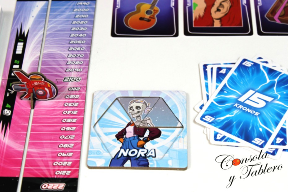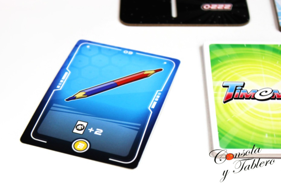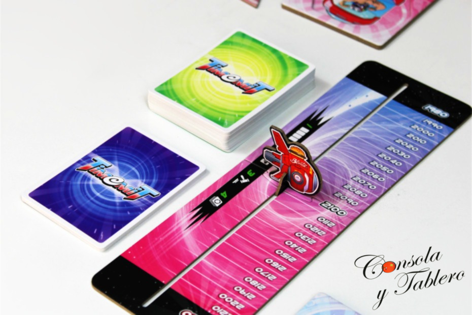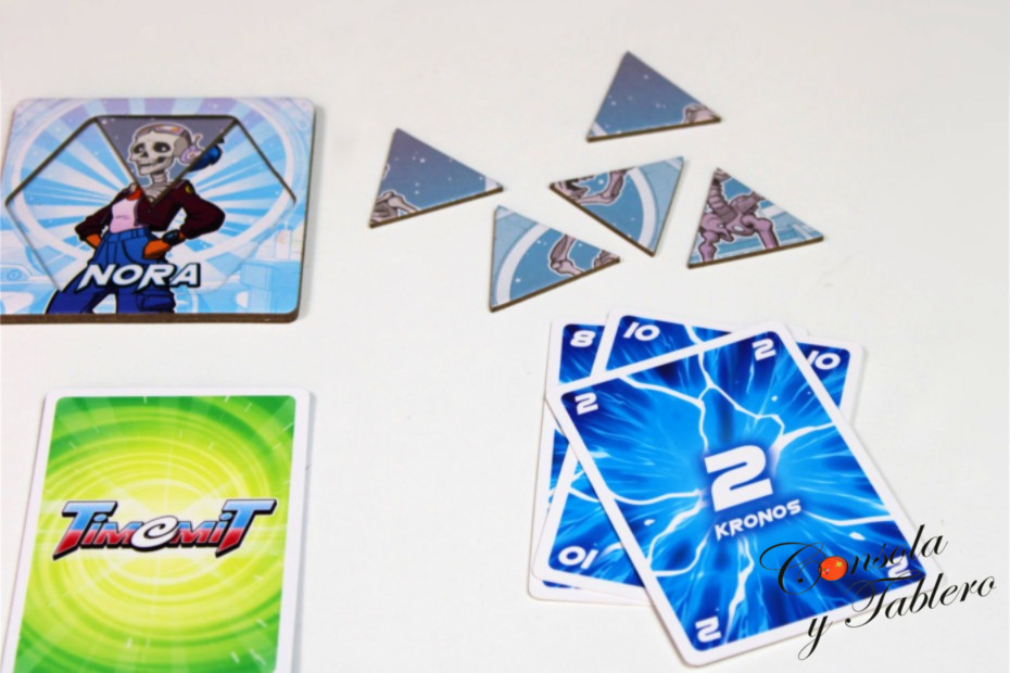 Componentes de TimemiT.Antes de empezar, elegimos bando. Cada jugador recibe sus componentes.Preparamos el escenario.Cada ronda consta de cuatro fases.1. Inicio. Descubrimos tres cartas de poder y una de evento para formar la zona de subasta.2. Combate. De forma simultánea, extraemos cartas de nuestro mazo. Algunas tienen efectos.Si un mismo símbolo se repite tres o más veces, se produce una paradoja. Por tanto, el riesgo aumenta conforme levantemos más cartas.Cuando se produzca, colocamos una ficha de paradoja en nuestro personaje, retrasamos la nave una posición y terminamos la segunda fase.3. Subasta. Quien tenga la nave más cerca de su objetivo empieza a pujar por todas las cartas que quiera, utilizando las cartas de kronos que aún conserve.Al terminar, le toca al rival.Revelamos las cartas de kronos para cada carta, por orden.Quien gane la puja, descarta las cartas de krono utilizadas.Se aplica el posible efecto inmediato de la carta obtenida. Se añade al mazo propio, bocarriba.Los efectos inmediatos permiten eliminarnos cartas que estorben, avanzar la nave o quitarnos fichas de paradoja, entre otros.Las cartas obtenidas también cuentan con efectos que realizaremos una vez que las extraigamos de nuestro mazo.Los eventos funcionan igual, aunque no se incorporan a ningún mazo.Se dejan a un lado para llevar el recuento de las rondas.4. Fin de ronda. Descartamos las cartas de poder reveladas en la ronda.Si queremos recuperar las cartas de kronos gastadas, debemos añadir una ficha de paradoja a nuestro personaje y retrasar la nave cuatro espacios.Si alguien tiene ya seis fichas de paradoja en su tablero, pierde automáticamente.La partida también puede acabar cuando un jugador alcance su extremo del tablero. Nora gana al llegar a 1980.La IA vence en 2220.Al no cumplirse ninguna de estas condiciones tras la octava ronda, contamos los efectos de final de partida de las cartas obtenidas.Comprobamos resultados y movemos la nave en consecuencia.Gana quien esté más cerca de su objetivo.